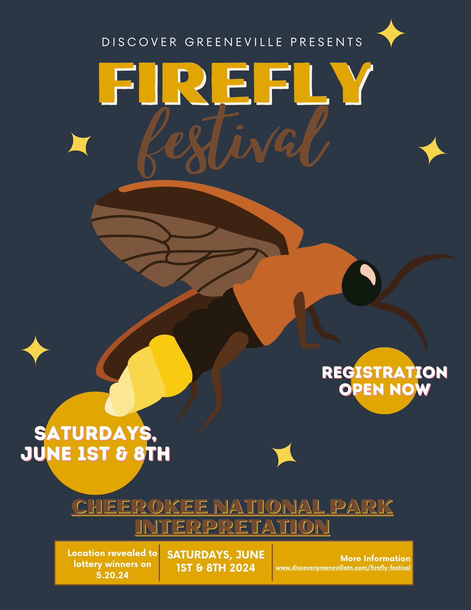 Join us for the enchanting Firefly Festival held on the first two Saturdays in June (1st & 8th). Attendance is exclusive to lottery winners, who will receive an email and it will be announced on our NEW Discover Greeneville page, Discover Greeneville Instagram, and GCP Facebook page. Limited parking is available, accessible only to those selected via lottery. Each vehicle/lottery ticket admits up to 7 people. If awarded, admission fee is $25 per car before May 24th 2024.
